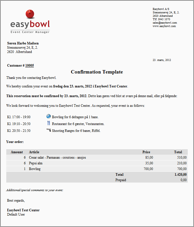 The ECM system automatically merges all the reservation details – name, address, date, time, products, etc., – into a letter template of your choice. Once you have configured however many letter templates you want, e.g. for a birthday party, a corporate party, league, or special events, it'll only take you a few seconds to make a confirmation.